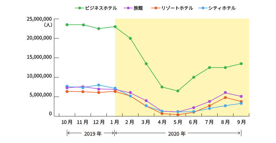 「2019年から2020年における延べ宿泊者数の推移」によると、国内で初めて感染者が確認された2020年1月を境に、各宿泊施設の宿泊者数が急激に落ち込んでいます。特に顕著なのが2020年5月で、旅館、リゾートホテル、ビジネスホテル、シティホテルのいずれの施設でも、調査期間中で宿泊者数が最も少ない時期となっています。