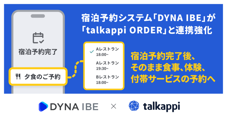 宿泊予約システム『DYNA IBE(ダイナ アイビーイー)』を提供するバリューコマース株式会社(本社:東京都千代田区、代表取締役社長 最高経営責任者:香川 仁)は、株式株式会社アクティバリューズ(本社:東京都渋谷区、代表取締役社長:陳 適)が提供する付帯サービスの予約・手配システム『talkappi ORDER(トーカッピ オーダー)』との連携を開始いたしました。